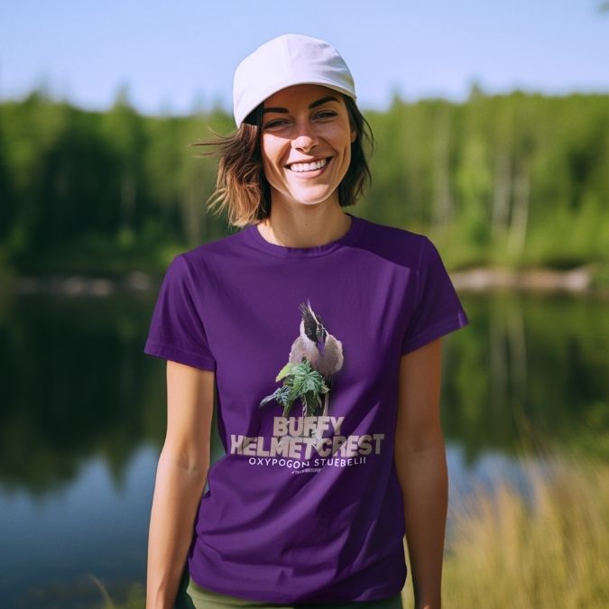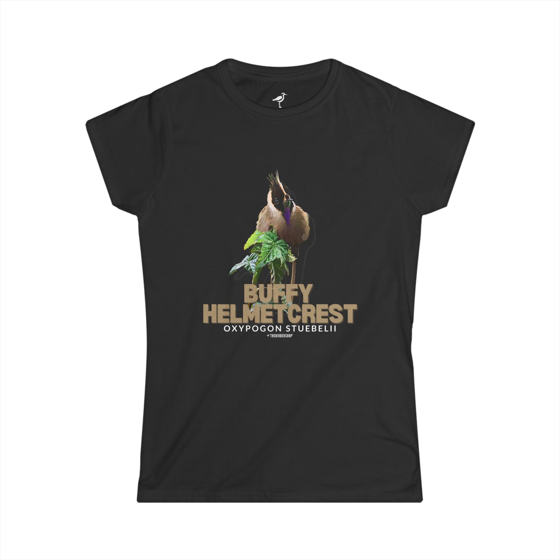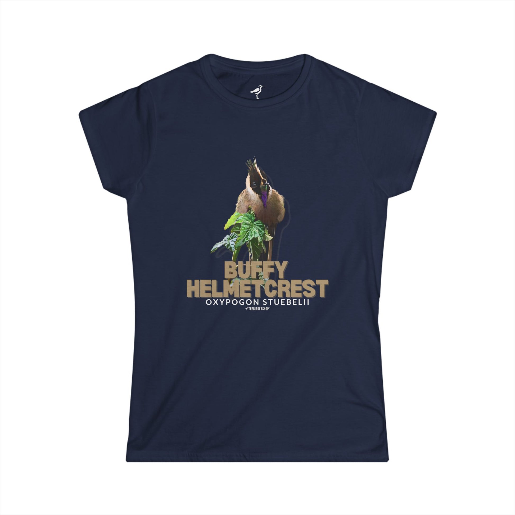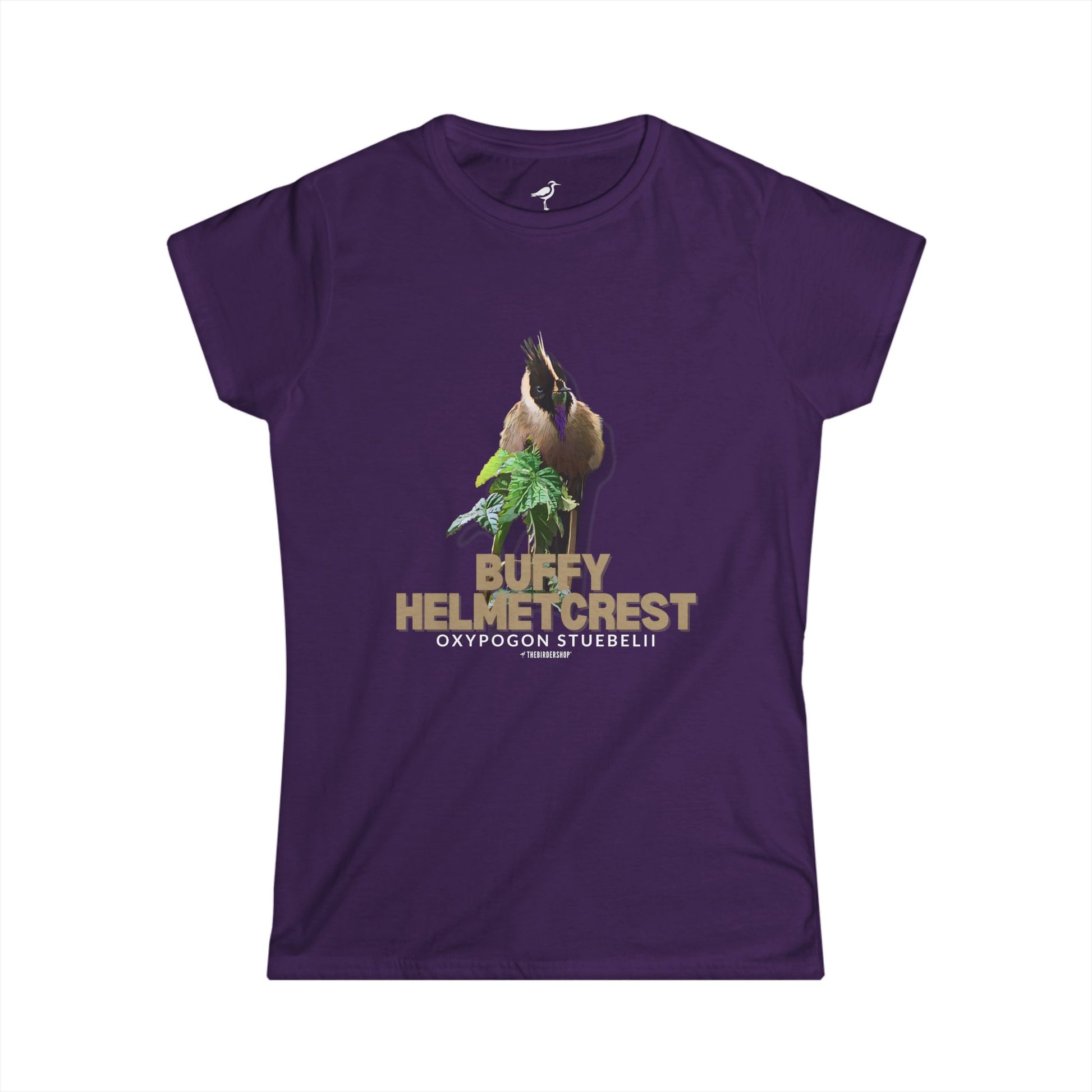 Delight in the wonders of neotropical birding with our women's softstyle tee featuring the exquisite Buffy Helmetcrest. Perfect for birders who admire rare and colorful species, this tee showcases the striking black and buffy crest and glittering green and purple gorget of the Buffy Helmetcrest. Made from 100% ringspun cotton, it offers a feminine fit with shortened sleeves, taped shoulders, and reinforced collar seam for durability. Celebrate your passion for nature and spread the unique charm of this rare and threatened hummingbird from the Central Andes of Colombia with a stylish, comfortable tee designed for your adventures.