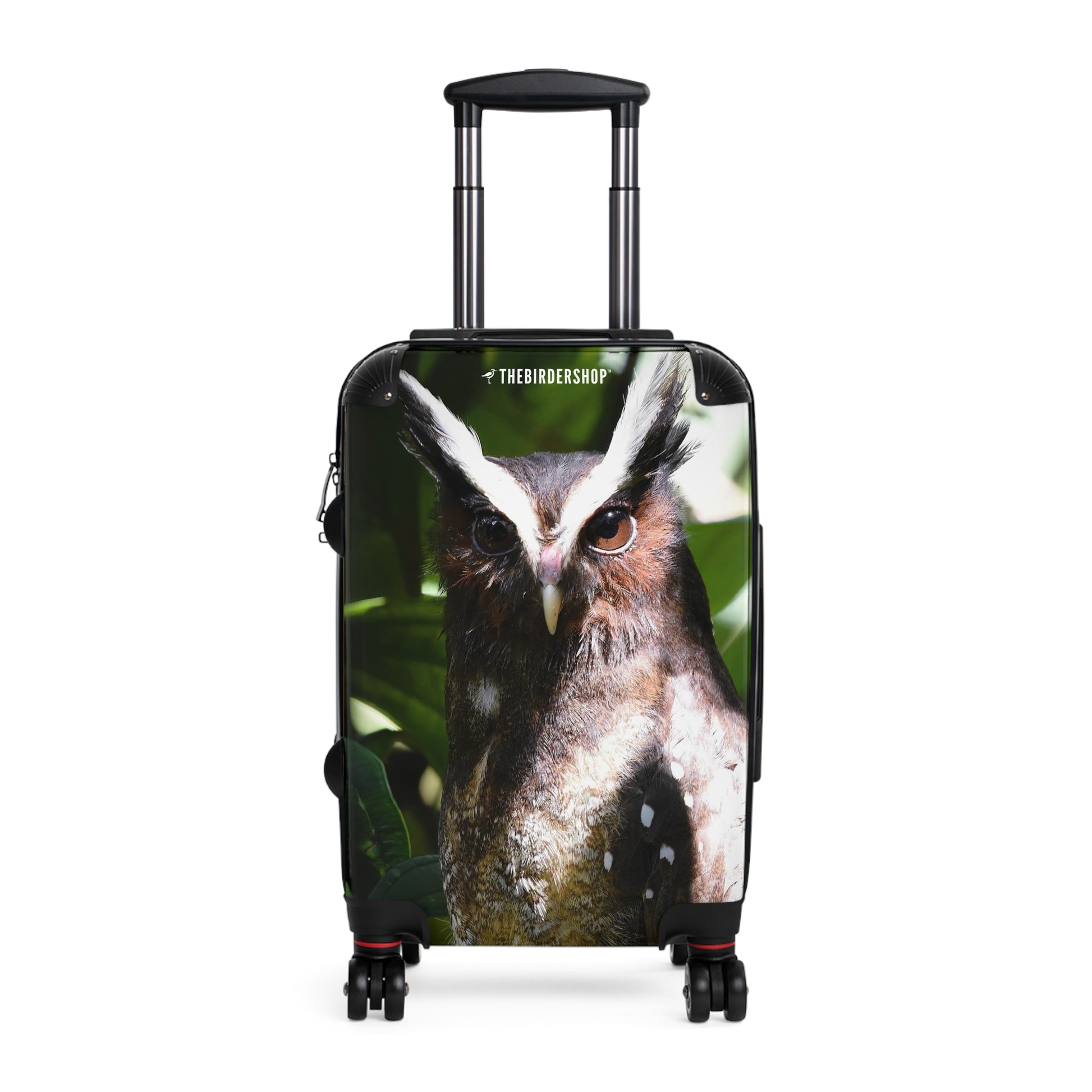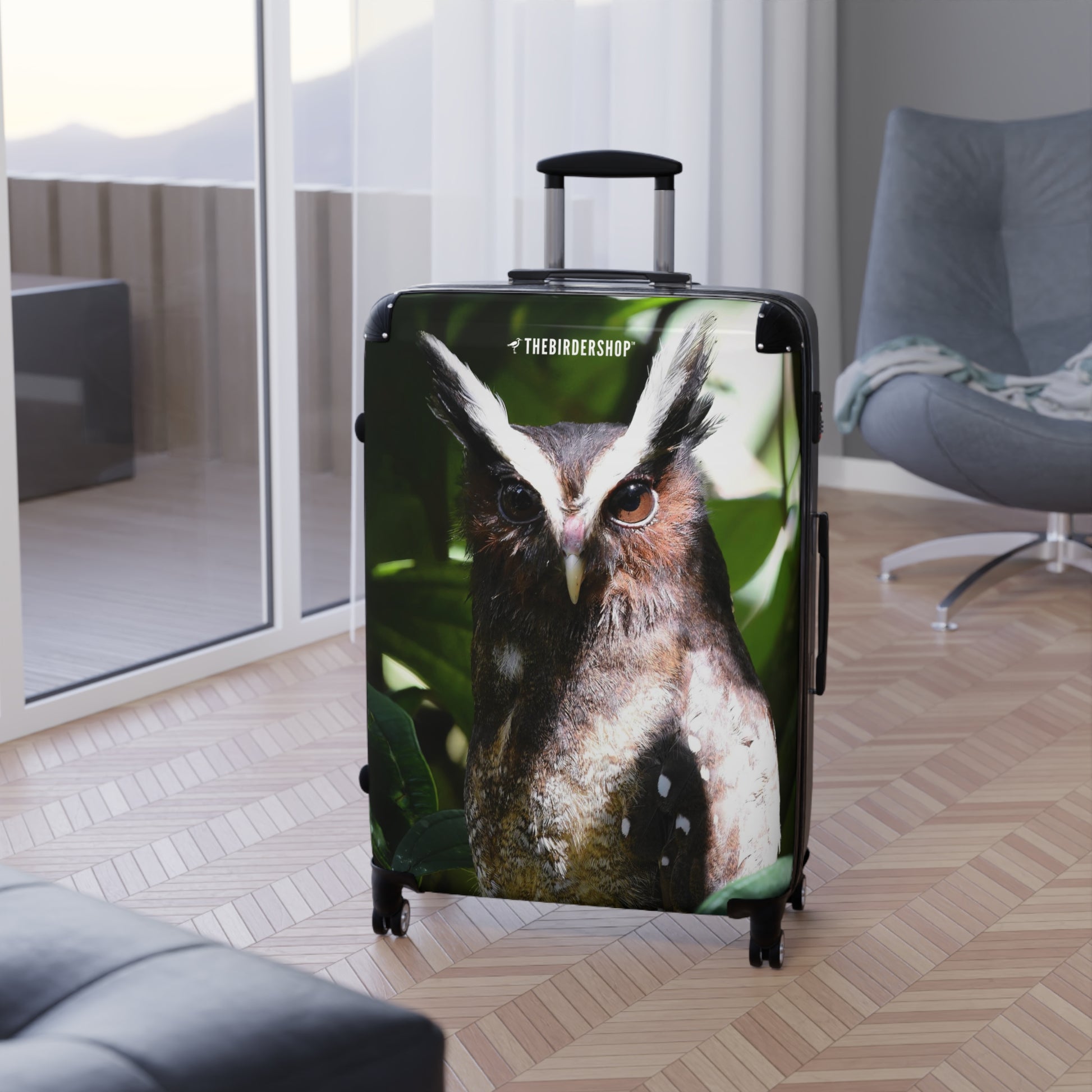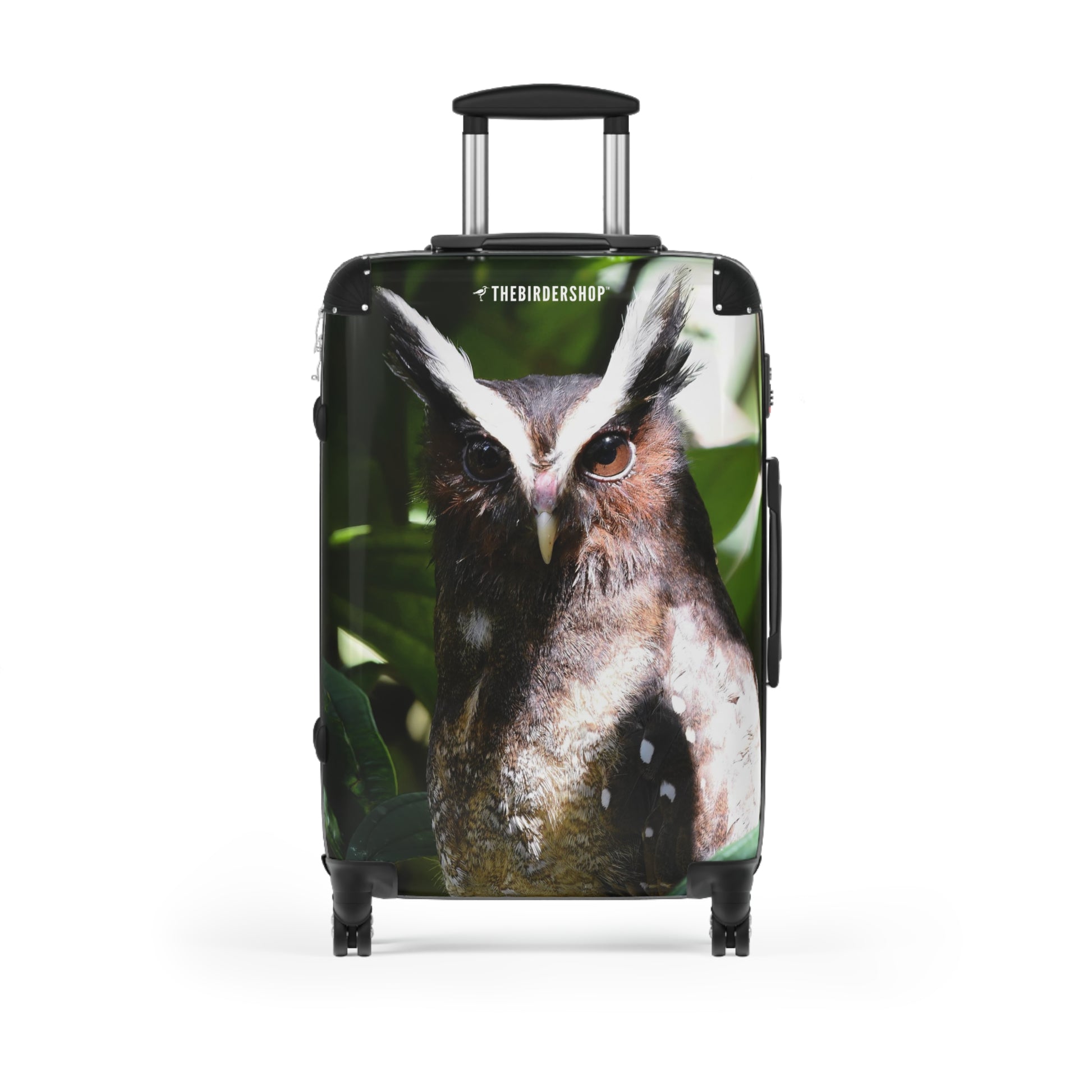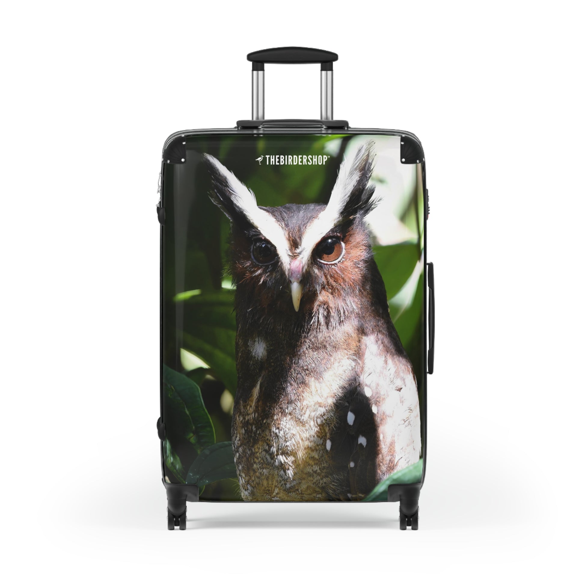 Embark on your adventures with our Crested Owl travel suitcase. Designed for birders who love the unique allure of neotropical birds, this suitcase features the striking Crested Owl with its distinctive white ear tufts and dark plumage. Available in three sizes, it offers 360-degree swivel wheels, a safety lock, and an adjustable handle for effortless travel. Made from a polycarbonate front and ABS back hard-shell, it combines durability with style, ensuring you travel in elegance while celebrating this remarkable bird.