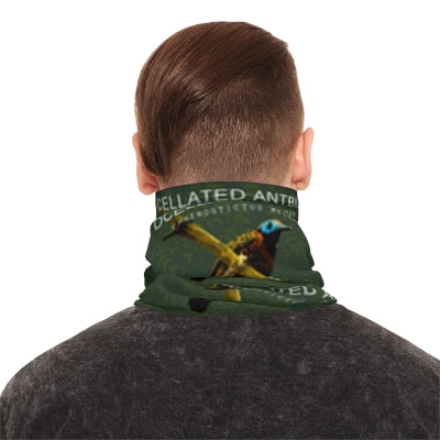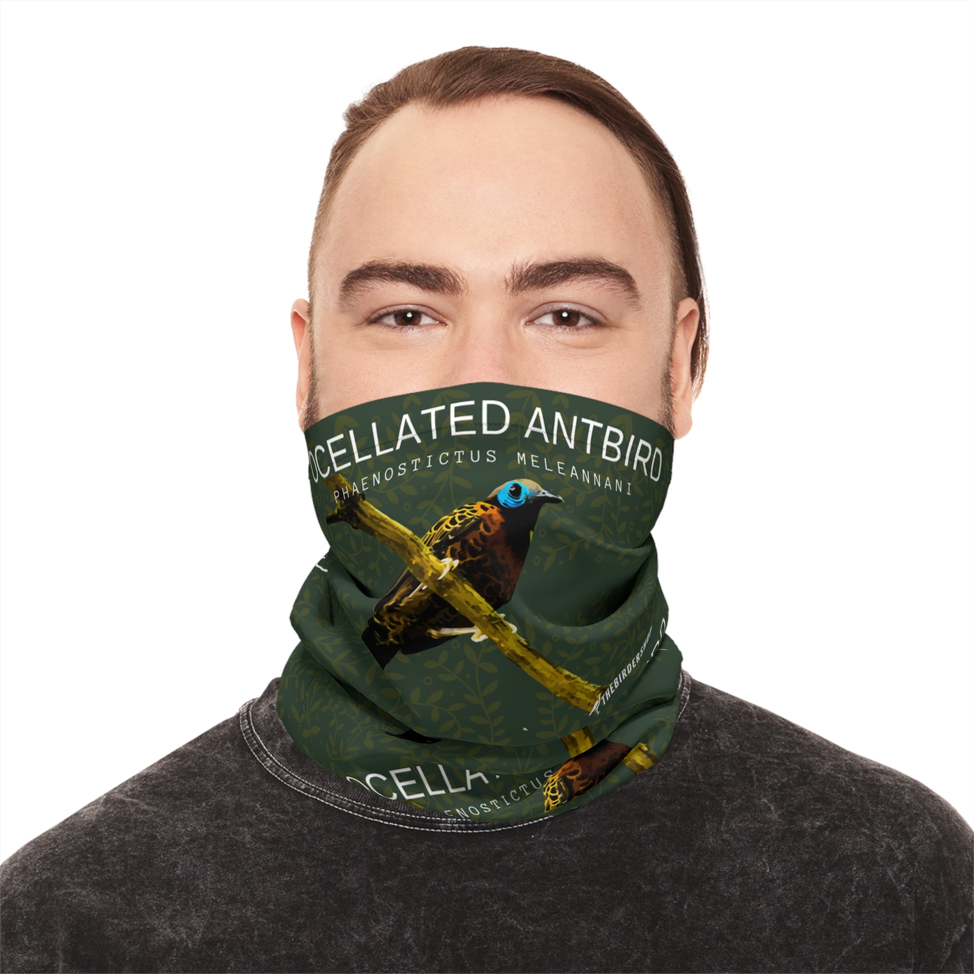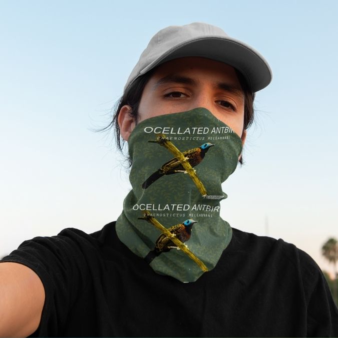 Enhance your birding adventures with our Ocellated Antbird Buffs. Perfect for those who admire neotropical birds, these buffs feature the striking Ocellated Antbird's vibrant, ornate plumage. Made from stretchy, moisture-wicking polyester microfiber, they are lightweight, breathable, and provide UPF 50+ protection. Ideal for shielding your head, ears and face from mosquitoes and the sun, they stay securely in place during any activity. Make this essential accessory part of your gear and embrace the beauty and uniqueness of the neotropical birding world. You may use it like this:
