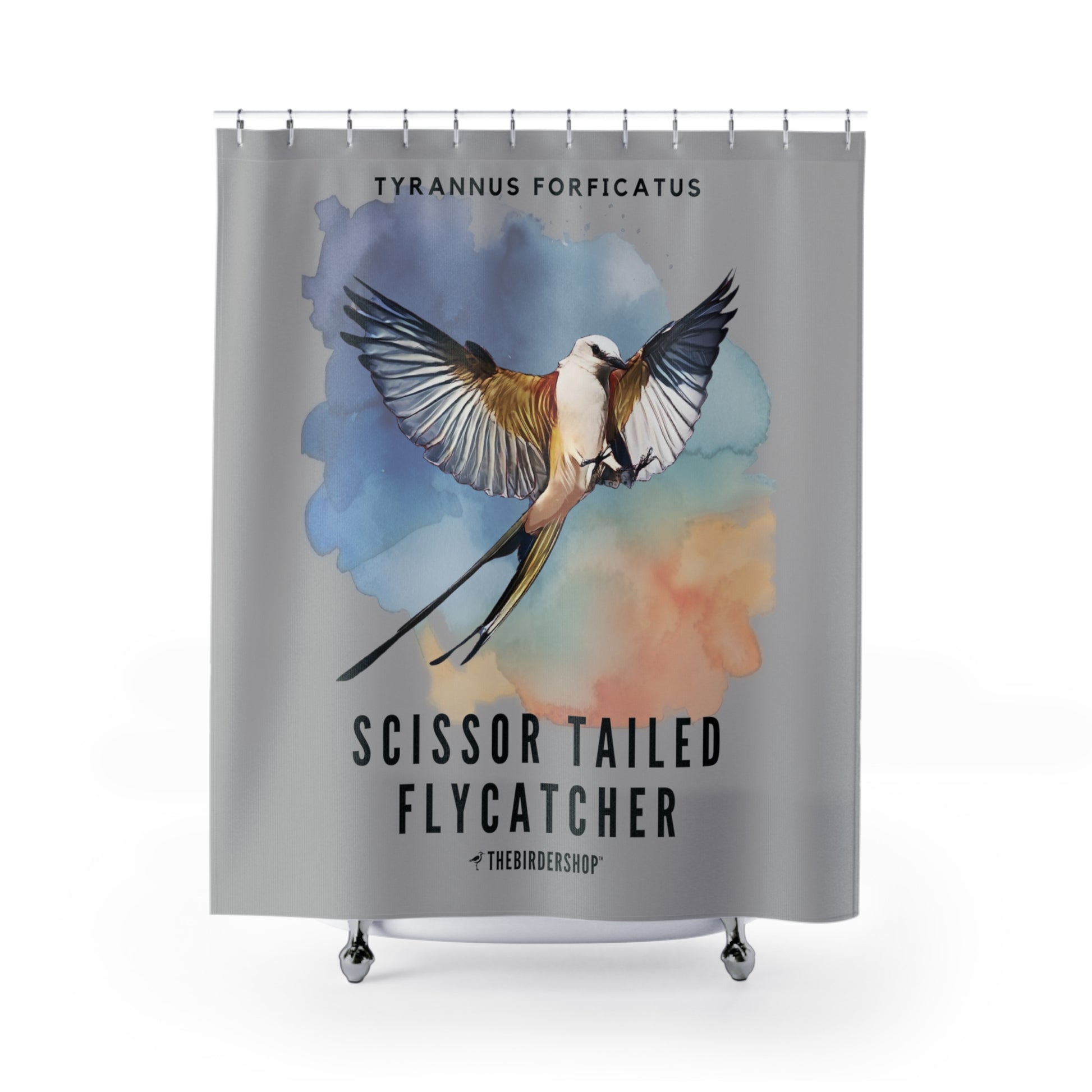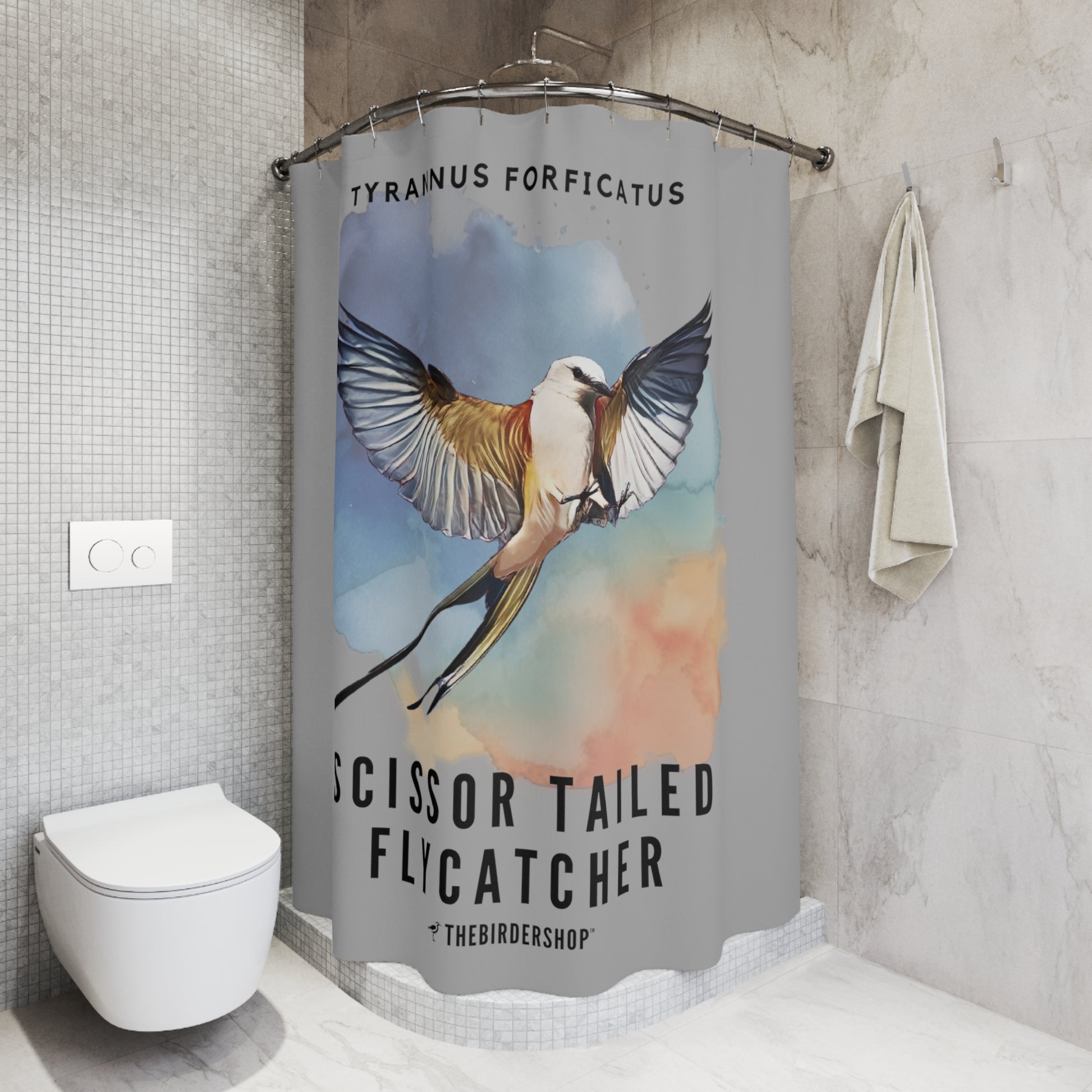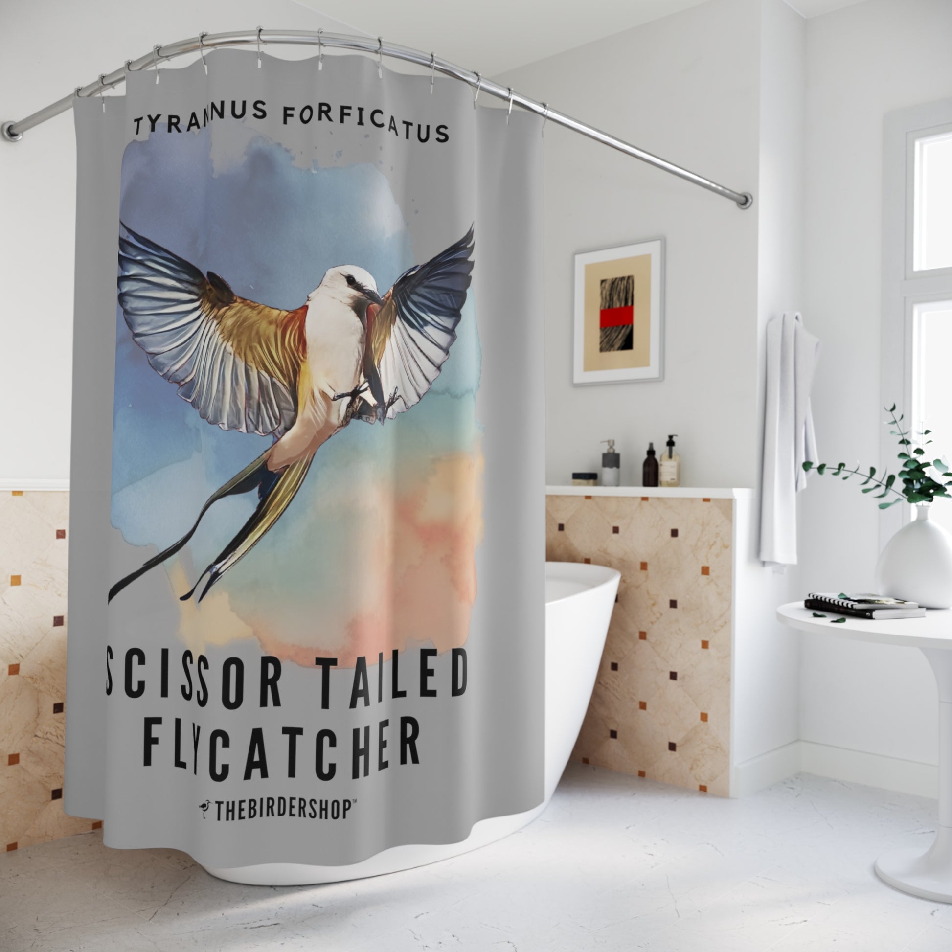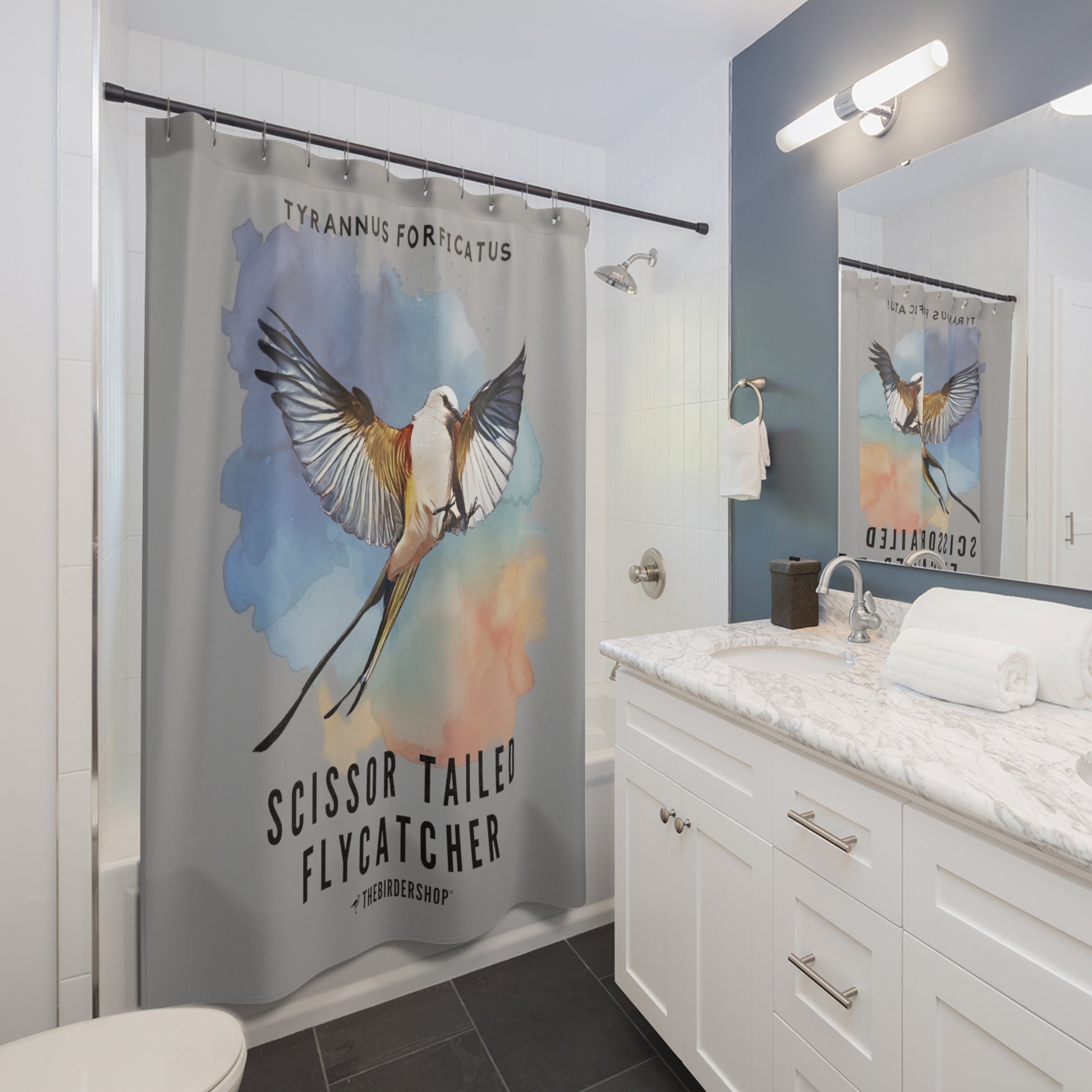 Discover the elegance of the Scissor-tailed Flycatcher in your bathroom! Our stunning shower curtain captures the vibrant colors and graceful swoops of this beloved North American flycatcher. Watch as this masterpiece of nature comes to life on durable, high-quality polyester, preserving its beauty for years to come. Admire the flycatcher's unique tail and hunting prowess daily, bringing the thrill of birding into your home. Don't miss this rare opportunity to own a piece of avian artistry!