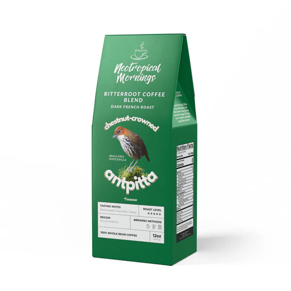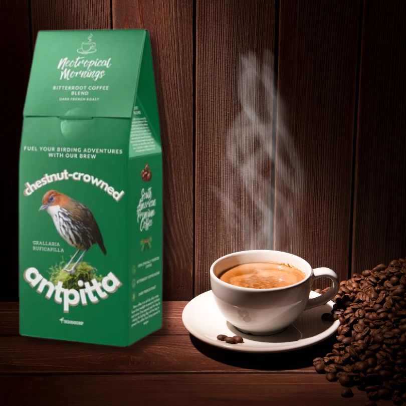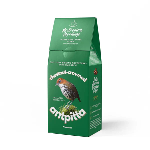 Birding without coffee is impossible, and our Chestnut-crowned Antpitta blend is your perfect companion for those early mornings. Ethically sourced from Colombia, this Dark French roast delivers bold, bittersweet flavors of cocoa and toasted nuts, providing the energy and warmth you need. Available in whole bean and ground options, it's perfect for any brewing method. Support sustainable practices and savor every cup. Enhance your birdwatching experience with this robust specialty coffee today.
